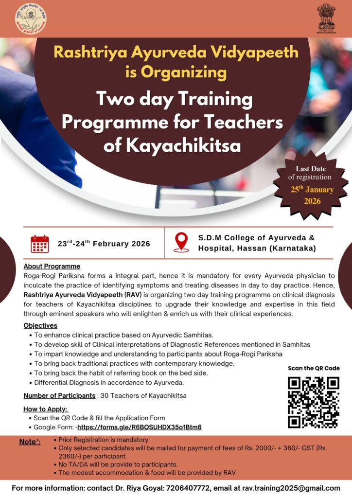 Two day Training Programme for Teachers of Kayachikitsa at Sri Dharmasthala Manjunatheshwara College of Ayurveda and Hospital, Hassan (Karnataka) on 23rd-24th February 2026 Post author:m56bookstore@gmail.com Post published:January 7, 2026 Post category:EVENTS UPDATES Post comments:0 Comments link – https://www.ravdelhi.nic.in/events/monthly-events You Might Also Like SIX Days CME Program for Teachers of Rasa Shastra and Bhaishajya Kalpana,Organized byAll India Institute of Ayurveda, New Delhi.Date : 8th to 13th September, 2025. July 24, 2025 3rd Training Course cum Workshop on Scientific Writing in Health Research,Organized byNational Institute of Health & Family Welfare, New Delhi.Date : 1st to 5th December, 2025. October 12, 2025 AYURVEDA DIETICIAN COURSE – FEBRUARY 2025 ALL INDIA INSTITUTE OF AYURVEDA LAST DATE 15 JAN 2025 ✅ January 5, 2025 Leave a Reply Cancel replyCommentEnter your name or username to comment Enter your email address to comment Enter your website URL (optional) Δ